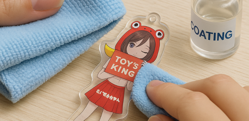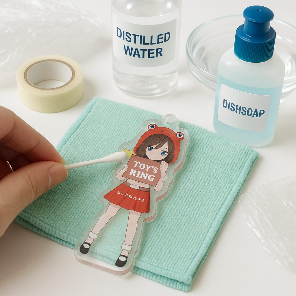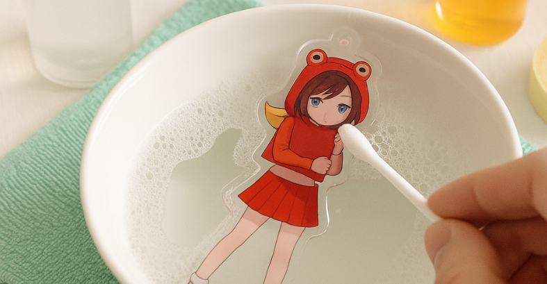 アクスタ(PMMA=アクリル樹脂)と、UV硬化インクの表面印刷/裏面印刷(裏刷り)、ラメ・箔・ホログラム台座などの実仕様に合わせて、印刷剥がれを起こさないベタつき・汚れの落とし方を解説します。フリーハンドの強摩擦・溶剤拭きは厳禁。基本は低刺激の薄液洗い→“ふやかす→転写”で安全に。